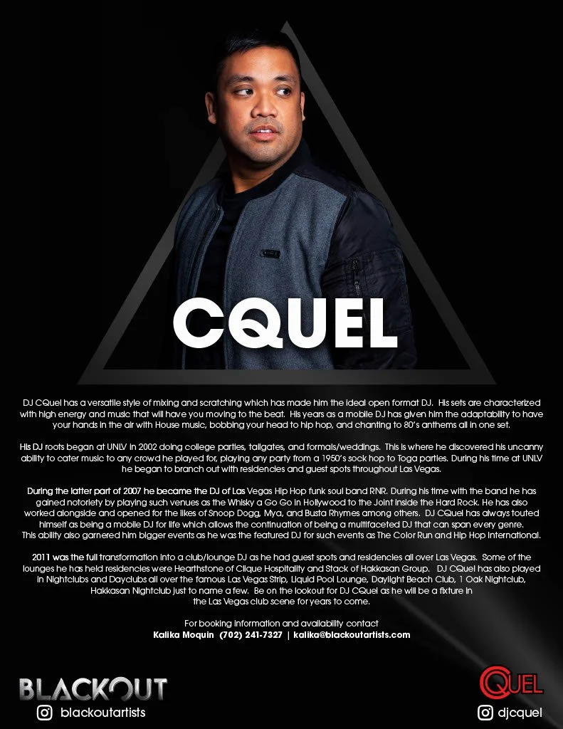 By 2011, DJ CQuel had established himself as a fixture in the Las Vegas nightlife scene, with residencies at elite venues like CliQue Bar and Lounge and Stack of Hakkasan Group. His performances at premier nightclubs and dayclubs, including Liquid Pool Lounge, Daylight Beach Club, 1 Oak Nightclub, and Hakkasan Nightclub, have made him a sought-after DJ for high-end events.